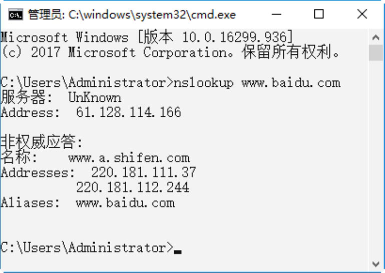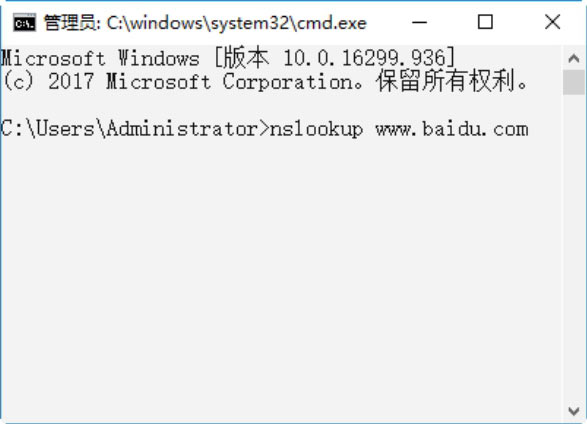Step 01 在“命令提示符”窗口中输入nslookup www.baidu.com命令,如下图所示。