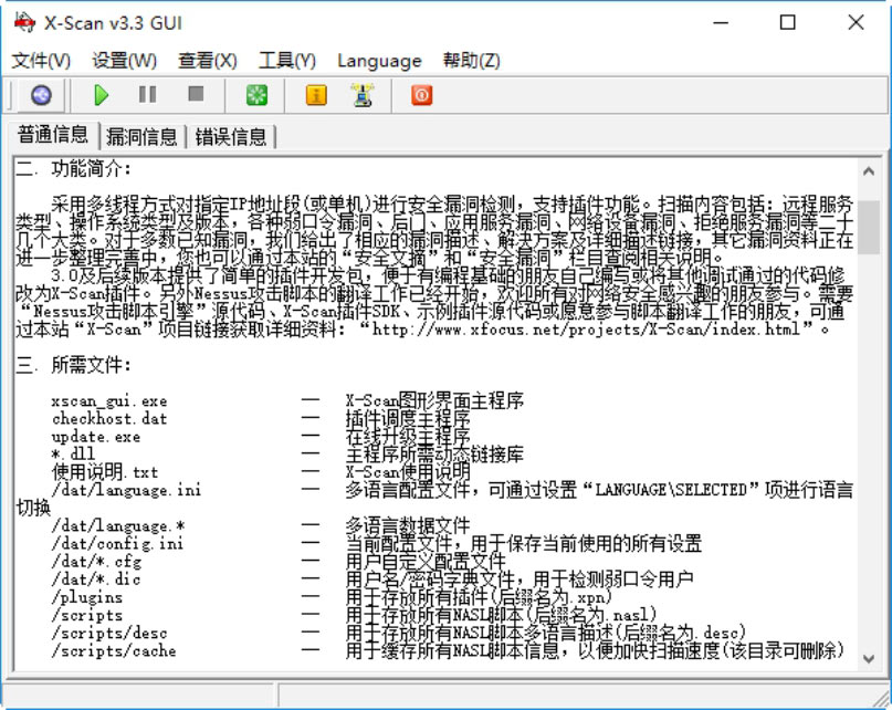 Step 01 在X-Scan文件夹中双击X-Scan_gui.exe应用程序,打开“X-Scan v3.3 GUI”主窗口,在其中可以浏览此软件的功能简介、常见问题解答等信息,如下图所示。