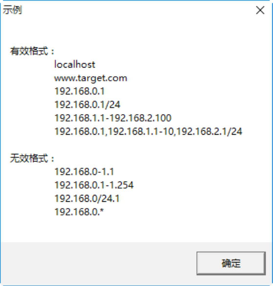 Step 03 在左边的列表中单击“检测范围”选项卡,然后在“指定IP范围”文本框中输入要扫描的IP地址范围。若不知道输入的格式,则可以单击“示例”按钮,即可打开“示例”对话框,在其中即可看到各种有效格式和无效格式,如下图所示。
