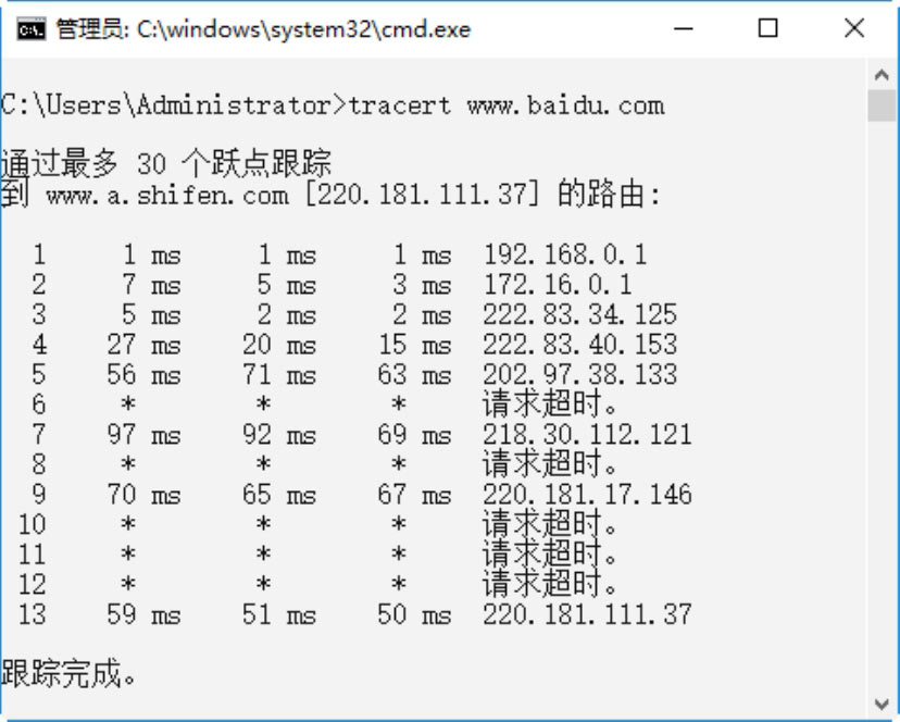 例如,要想了解自己计算机与目标主机www.baidu.com之间的详细路径传递信息,就可以在“命令提示符”窗口中输入tracert www.baidu.com命令进行查看,分析目标主机的网络结构,如下图所示。