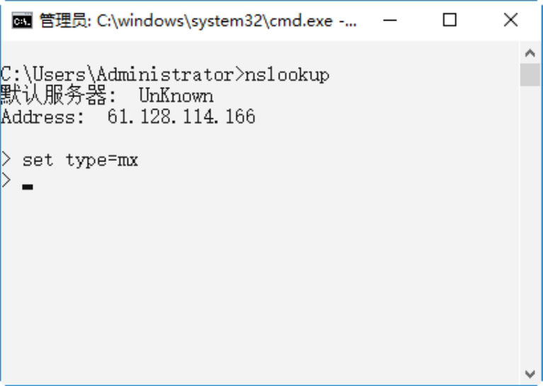 Step 02 在“命令提示符”窗口中输入set type=mx命令,然后按Enter键,进入命令运行状态,如下图所示。