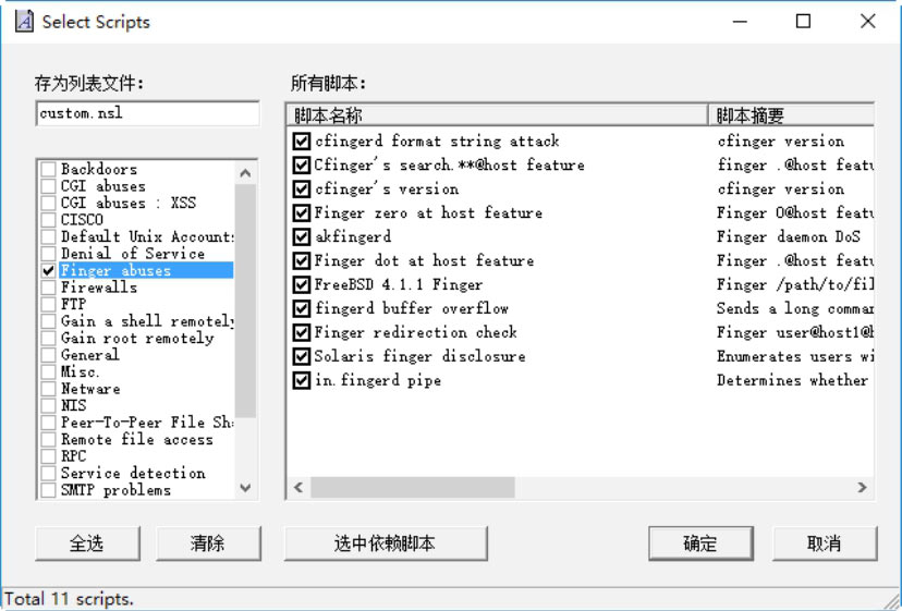 Step 11 切换到“漏洞检测脚本设置”子项,取消选中“全选”复选框后,单击“选择脚本”按钮,打开“Select Script(选择脚本)”对话框,如下图所示。