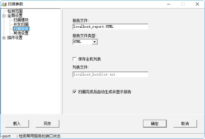 提示: 如果需要保存自己设置的扫描IP地址范围,则可在选中“保存主机列表”复选框后,输入保存文件名称,这样,以后就可以直接调用这些IP地址范围;如果用户需要在扫描结束时自动生成报告文件并显示报告,则可选中“扫描完成后自动生成并显示报告”复选框。