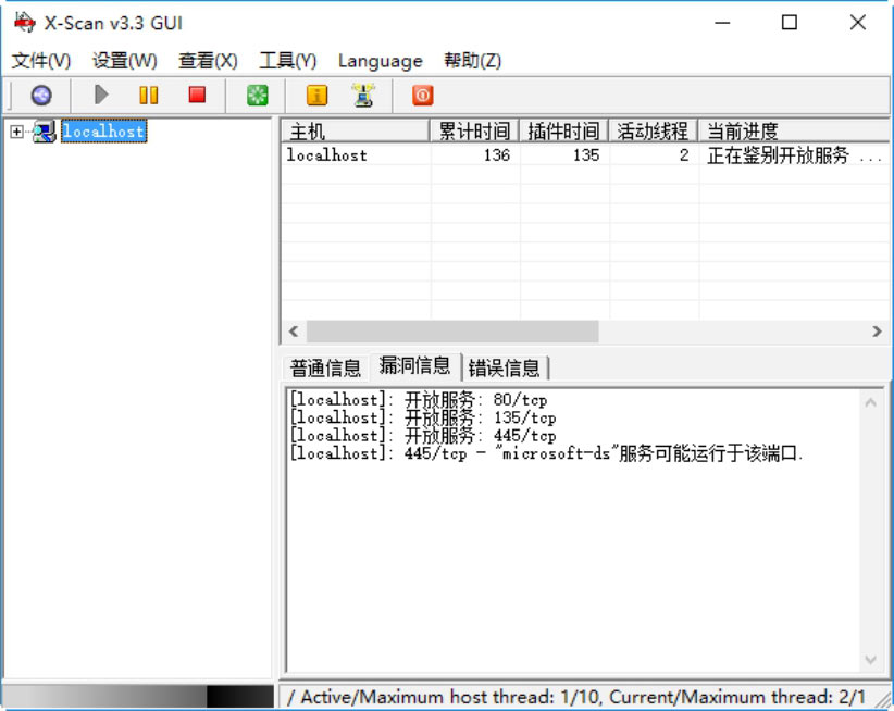Step 03 在“X-Scan v3.3 GUI”主窗口中切换到“漏洞信息”选项卡,在其中即可看到存在漏洞的主机信息,如下图所示。