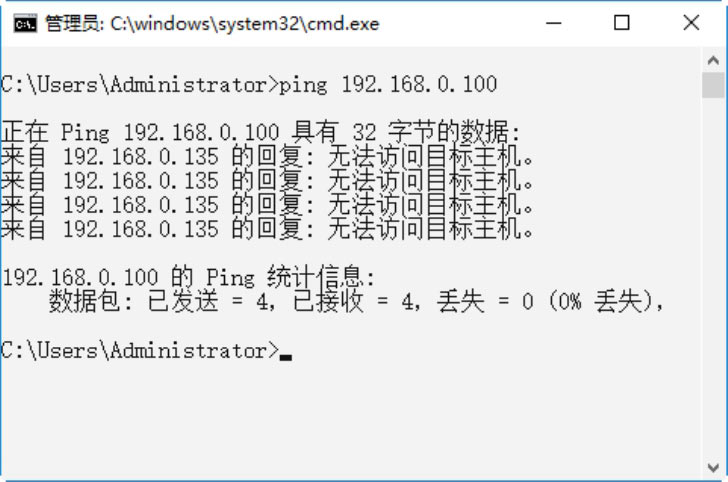 Step 04 如果ping不通过,则会出现“无法访问目标主机”提示信息,这就表明对方要么不在网络中、要么没有开机、要么是对方存在,但是设置了ICMP数据包的过滤等。如下图所示就是ping IP地址为192.168.0.100不通过的结果。
