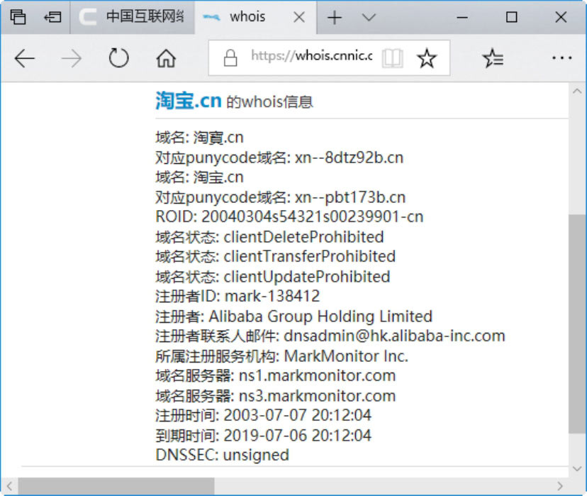Step 04 单击“确定”按钮,即可看到要查询域名的详细信息,如下图所示。