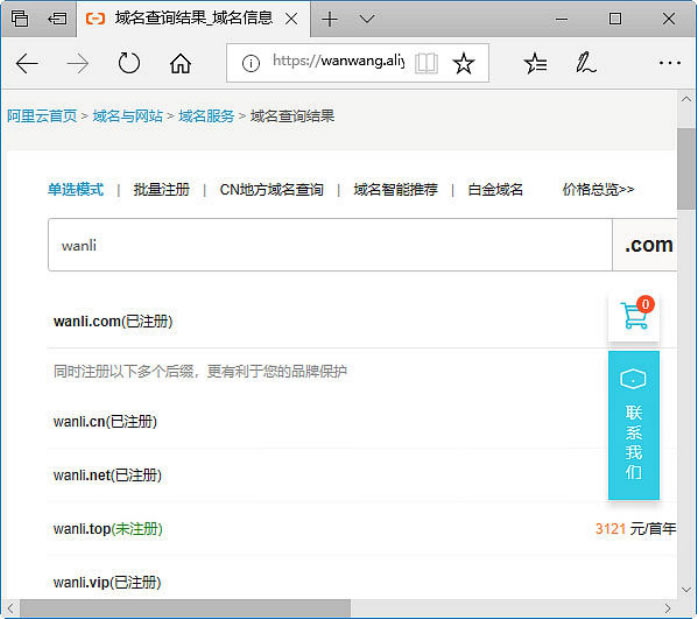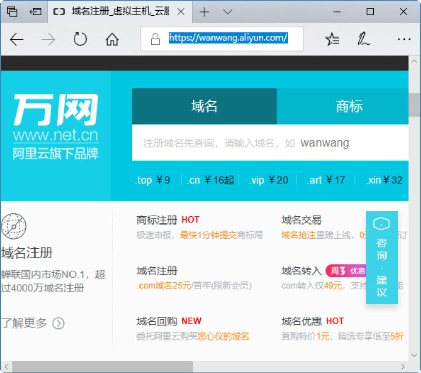 Step 01 在Microsoft Edge浏览器的地址栏中输入万网的网址https://wanwang.aliyun.com/,即可打开其查询页面,如下图所示。
