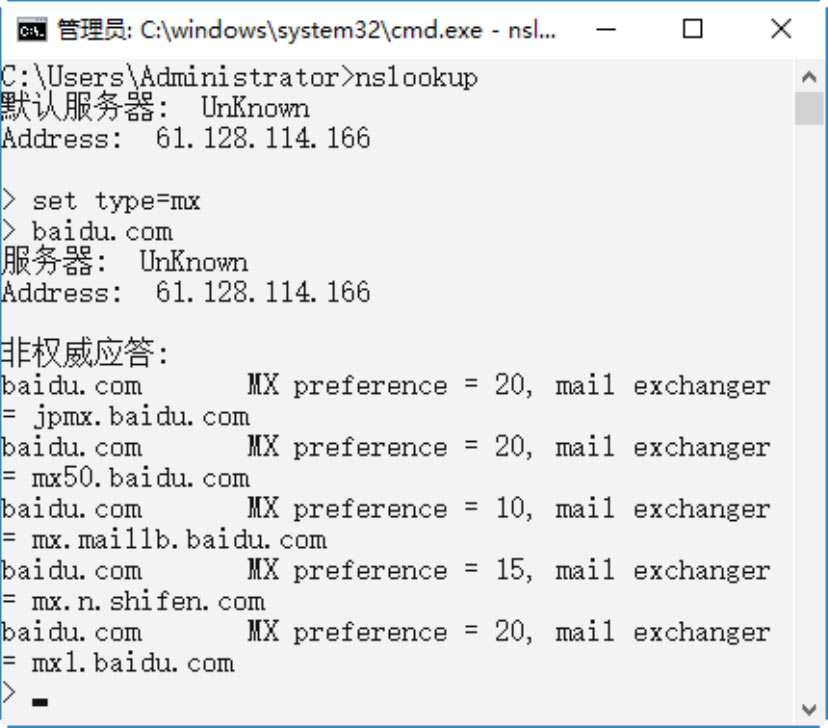 可以使用nslookup的交互模式对域名进行查询,具体的操作步骤如下。