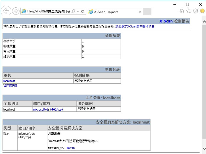 Step 02 扫描完成后,即可看到HTML格式的扫描报告,如下图所示。在其中即可看到活动主机IP地址、存在的系统漏洞和其他安全隐患,同时还提出了安全隐患的解决方案。