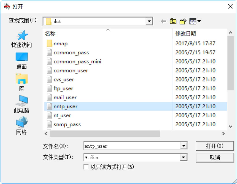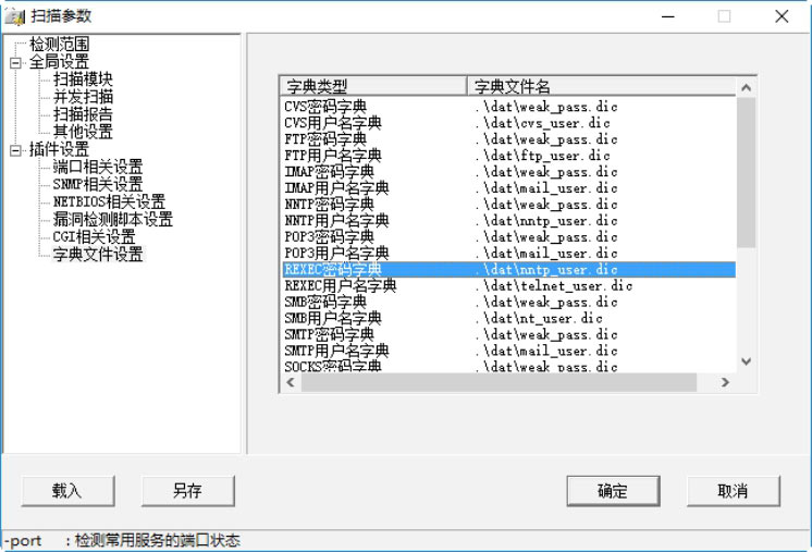 Step 15 在其中选择相应的字典文件后,单击“打开”按钮,返回到“扫描参数”对话框,即可完成字典类型所对应的字典文件名的设置,如下图所示。在设置好所有选项之后,单击“确定”按钮,即可完成设置。