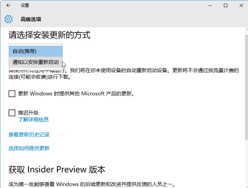 Step 08 单击“高级选项”超链接,打开“高级选项”设置工作界面,在其中可以选择安装更新的方式,如下图所示。