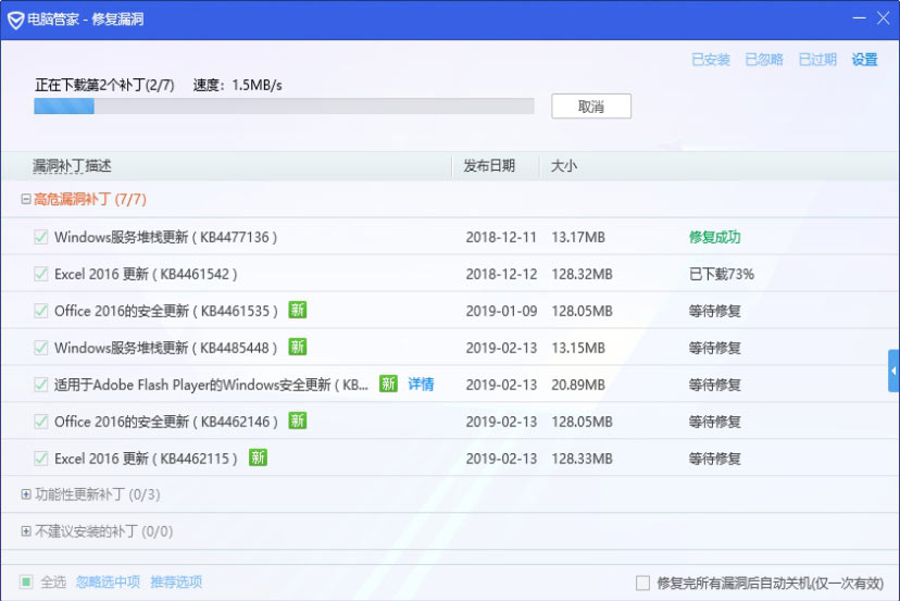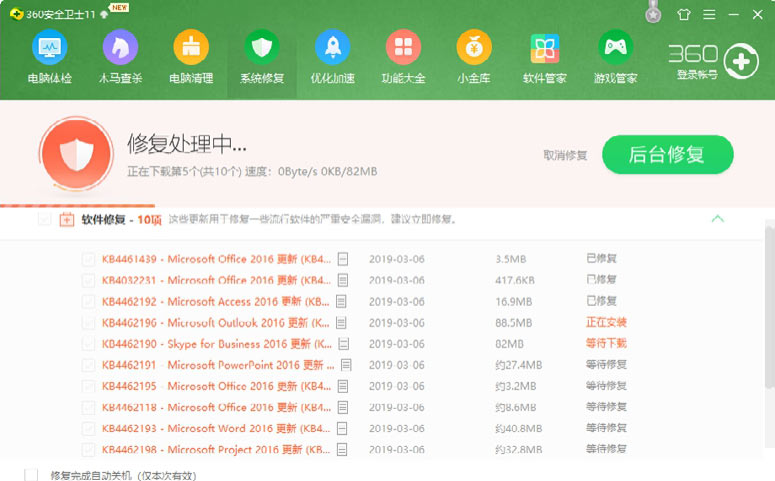Step 03 单击“一键修复”按钮,即可下载并修复系统漏洞,如下图所示。