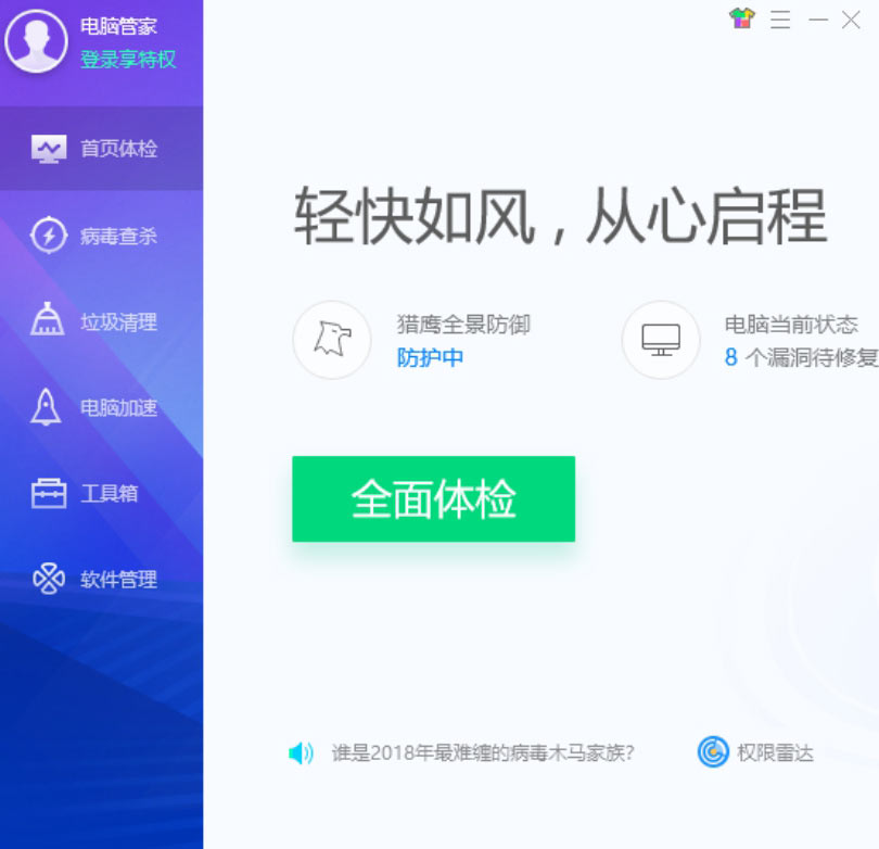 Step 01 下载并安装《腾讯电脑管家》,即可打开电脑管家的“首页体验”页面,如下图所示。