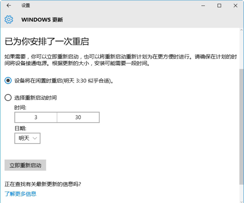 Step 07 单击“立即重新启动”按钮,立即重新启动计算机,重新启动完毕后,再次打开“Windows更新”窗口,在其中可以看到“你的设备已安装最新的更新”信息提示,如下图所示。