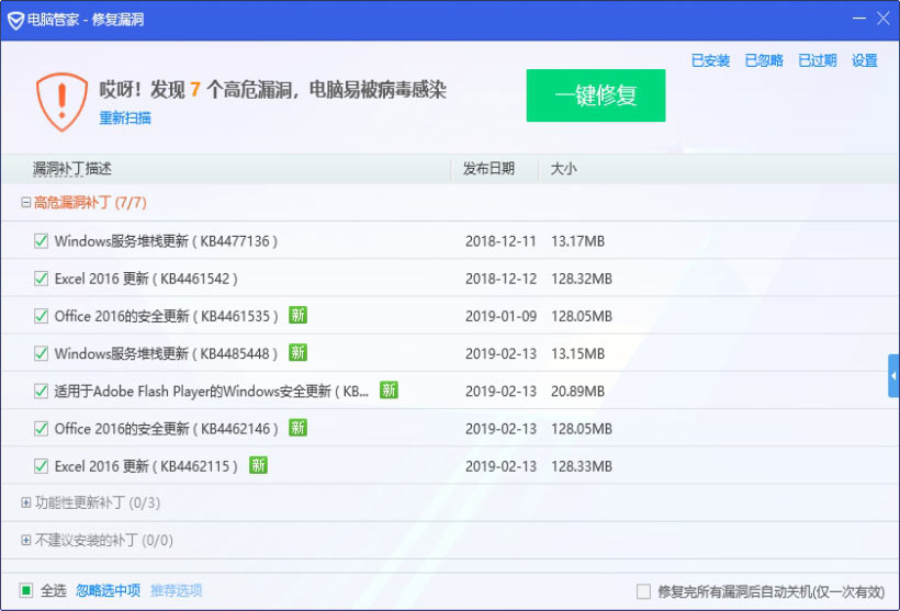 ”图标,即可进入“电脑管家-修复漏洞”工作界面,在其中可以看到当前系统存在的漏洞信息,如下图所示。