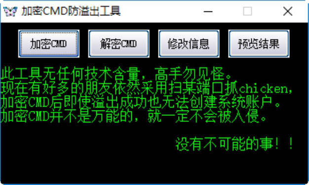 在对CMD进行加密后,即使黑客获得了CMD Shell,但是在利用系统命令添加账号时,会通过TFTP、FTP和VBS等方式上传文件或进一步控制服务器时,由于各种命令被进行了权限设置,也无法获取溢出主机的控制权,这就起到了保护主机的目的。