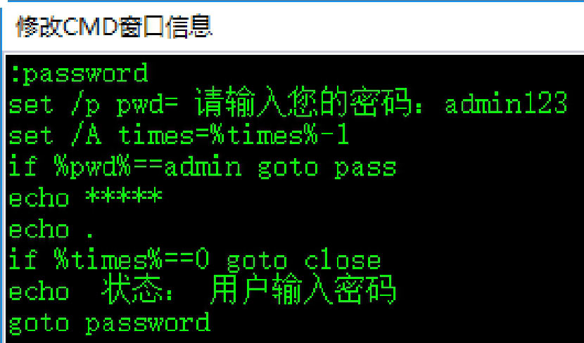 Step 04 如果想要修改默认的密码,则可以单击“加密CMD防溢出工具”主界面中的“修改信息”按钮,打开“修改CMD窗口信息”代码窗口,在其中的admin参数修改为自己设置的密码即可,如下图所示。