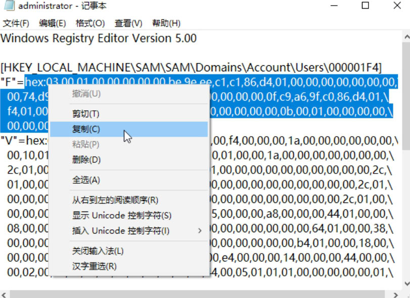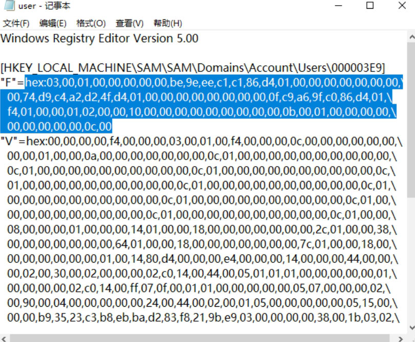 Step 08 用记事本打开administrator.reg,选中"F"=后面的内容并复制下来,然后打开user.reg,将"F"=后面的内容替换掉,如下图所示。完成后,将user.reg进行保存。