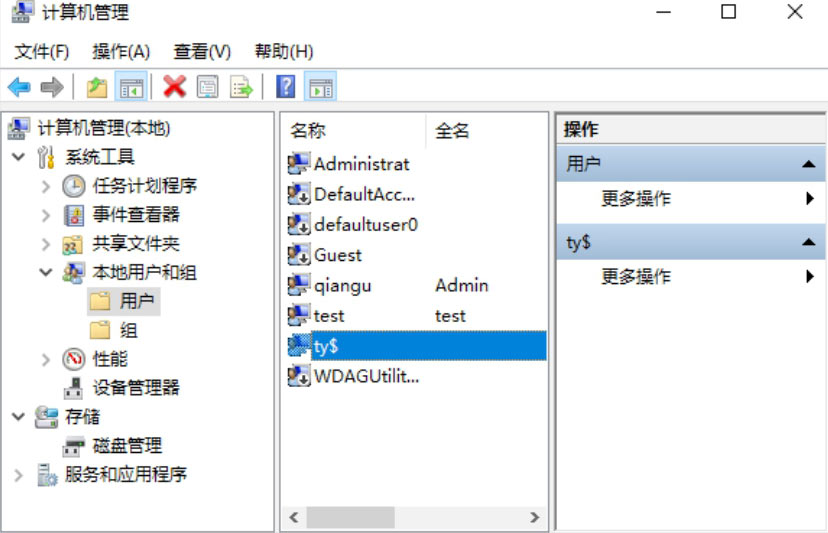 Step 02 依次展开“系统工具”→“本地用户和组”→“用户”选项,这时在右侧的窗格中可以发现创建的ty$隐藏账号依然会被显示,如下图所示。