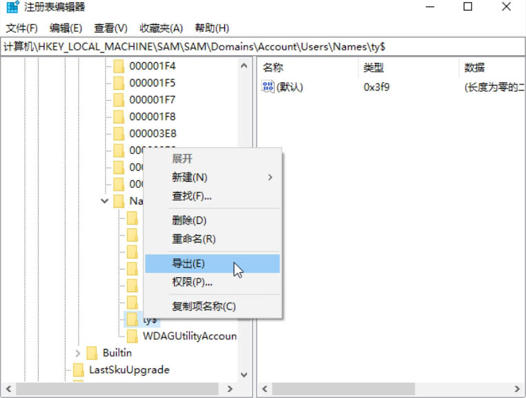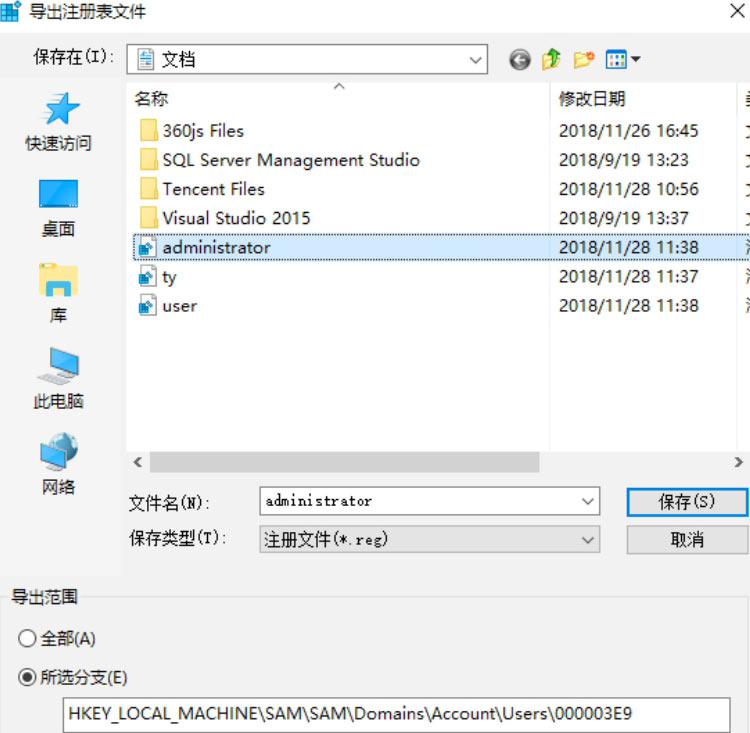 Step 07 按照步骤5的方法,将HKEY_LOCAL_MACHINE\SAM\SAM\Domains\Account\Users\下的000001F4和000003E9项分别导出并命名为administrator.reg和user.reg,如下图所示。