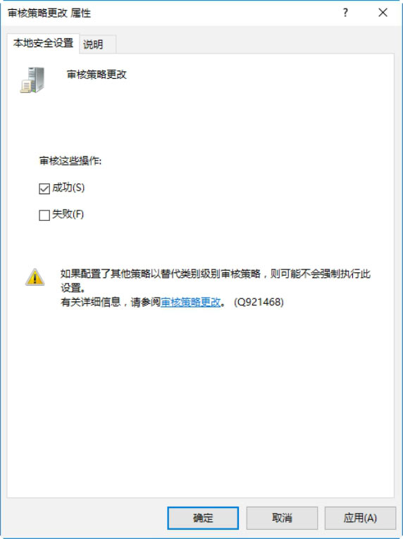 Step 03 双击右侧窗口中的“审核策略更改”选项,打开“审核策略更改 属性”对话框,选中“成功”复选框,单击“确定”按钮保存设置,如下图所示。