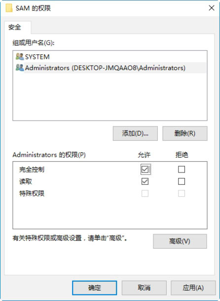 Step 03 打开“SAM的权限”对话框,在“组或用户名”栏中选择Administrators,然后在“Administrators的权限”栏中选中“完全控制”和“读取”复选框,单击 “确定”按钮保存设置,如下图所示。