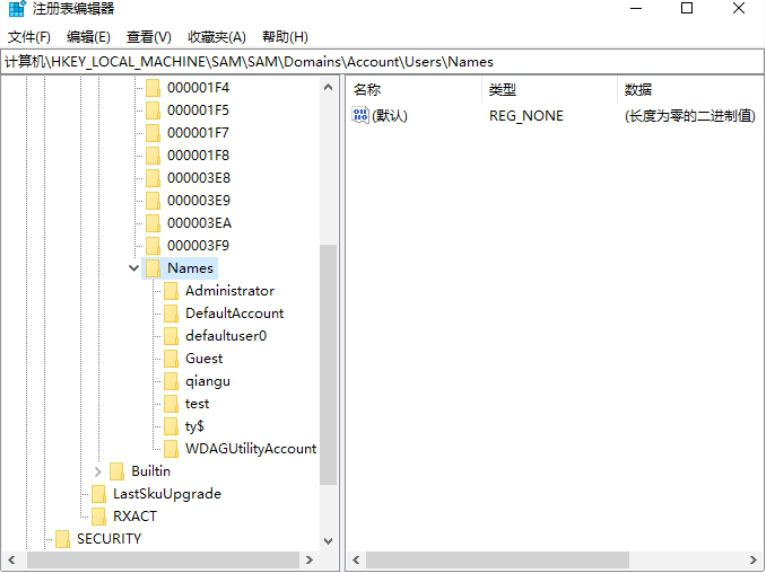 Step 04 依次选择HKEY_LOCAL_MACHINE\SAM\SAM\Domains\Account\Users\ Names注册表项,即可查看到以当前系统中的所有系统账户名称命名的子项,如下图所示。