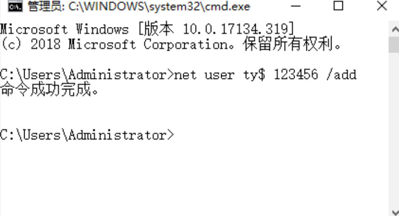 Step 02 单击“确定”按钮,打开“命令提示符”窗口,在其中输入net user ty$ 123456/add命令,按Enter键,即可成功创建一个名为ty$,密码为“123456”的隐藏账号,如下图所示。