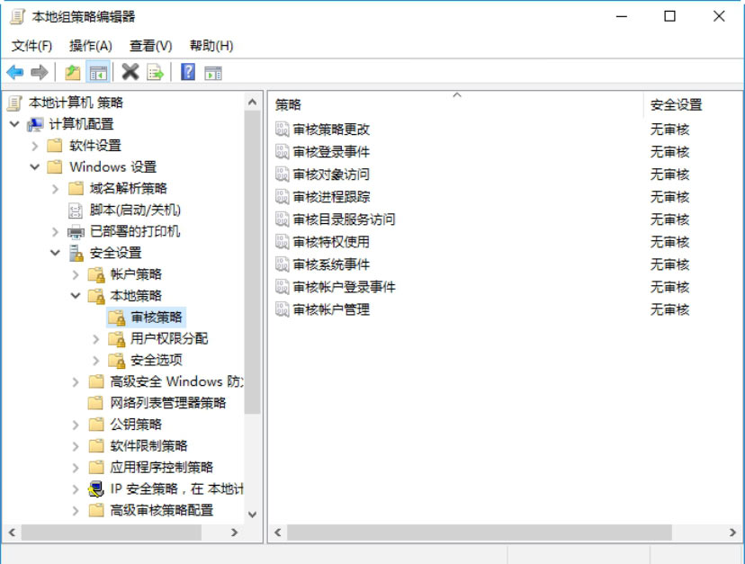 Step 02 单击“确定”按钮,打开“本地组策略编辑器”窗口,依次展开“计算机配置”→“Windows设置”→“安全设置”→“本地策略”→“审核策略”选项,如下图所示。
