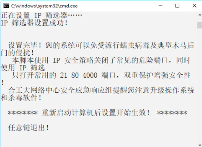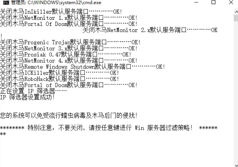 Step 02 关闭结束后,系统中的危险端口就全部被关闭掉了。当程序停止后,不要关闭 “命令提示符”窗口,这时按任意键,或继续运行“Win服务器过滤策略”,然后再进行木马服务端口的关闭,全部完成后,系统才做到真正的安全,如下图所示。