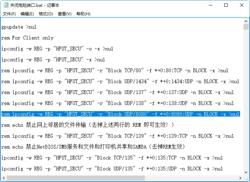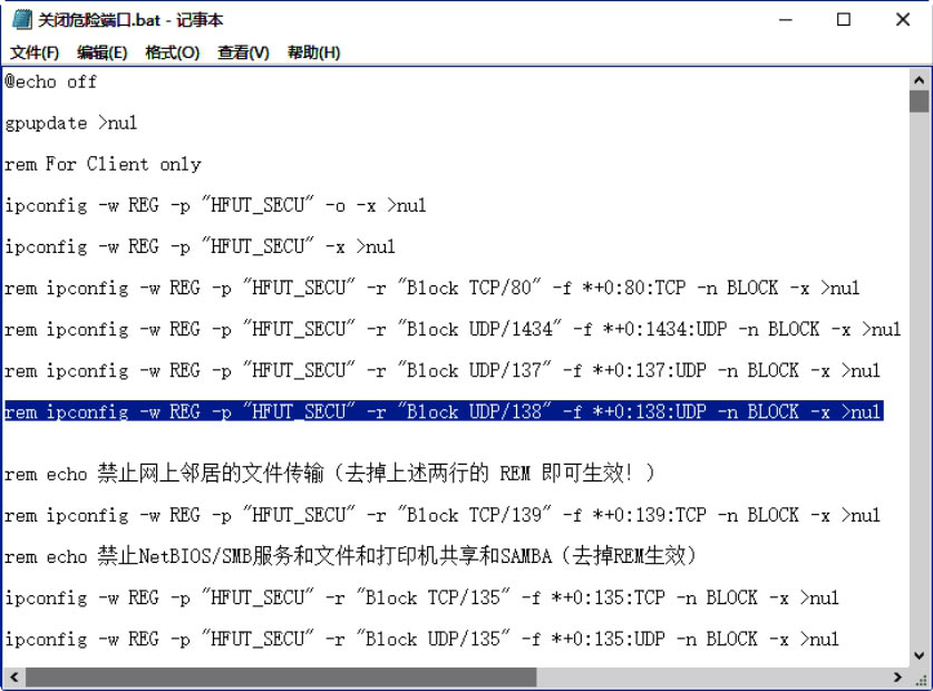 Step 03 使用“危险端口关闭小助手”工具还可以手工修改、自动关闭端口,利用该功能可以把最新的端口添加到关闭的列表中。用记事本打开“关闭危险端口.bat”文件,即可在其中看到关闭端口的重要语句rem ipconfig -w REG -p “HFUT_SECU” -r “Block UDP/138” -f *+0:138:UDP -n BLOCK -x>nul,其中UDP参数用于指定关闭端口使用的协议,138参数是要关闭的端口。