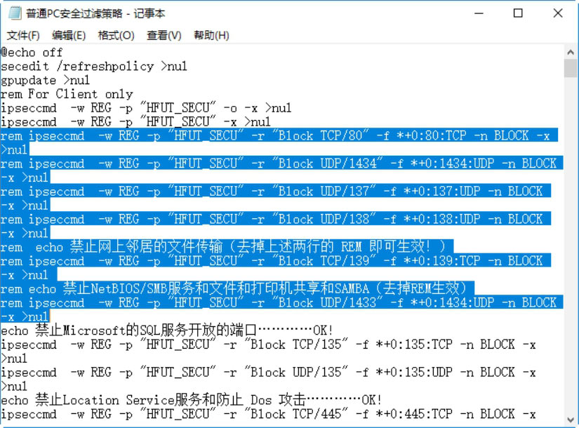 Step 04 使用相同的方法解压缩“普通PC安全过滤策略.exe”文件,然后再解压缩其中的“普通PC安全过滤策略.bat”文件并用记事本打开,搜索其中以“rem ipseccmd…”开头的字符串,如下图所示。