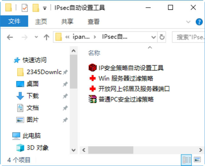 Step 03 关闭网上邻居和共享。用WinRAR工具打开“IP安全策略自动设置工具”的主程序“IPsec自动设置工具.exe”,在其中可以看到有4个自解压文件,如下图所示。