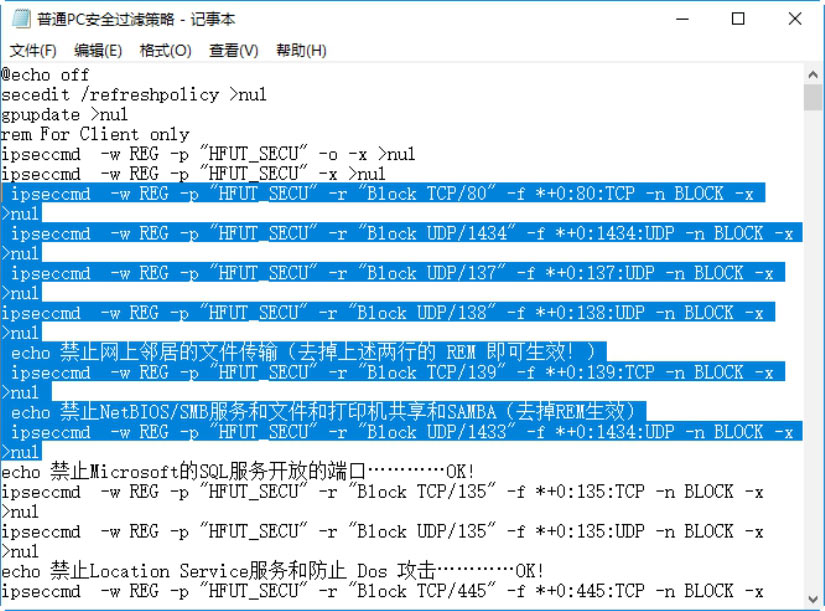 第一种:适合普通单机的IP安全策略,执行后可以过滤常见的危险端口访问,也可以对家庭用户的Windows系统进行设置,但是不适合服务器的系统。