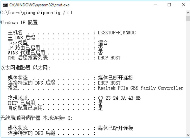 在“命令提示符”窗口中输入ipconfig/all命令,然后按Enter键,可以在显示的结果中看到一个MAC地址:00-23-24-DA-43-8B,这是本机的物理地址,也是本机的网卡地址,它是唯一的,如下图所示。
