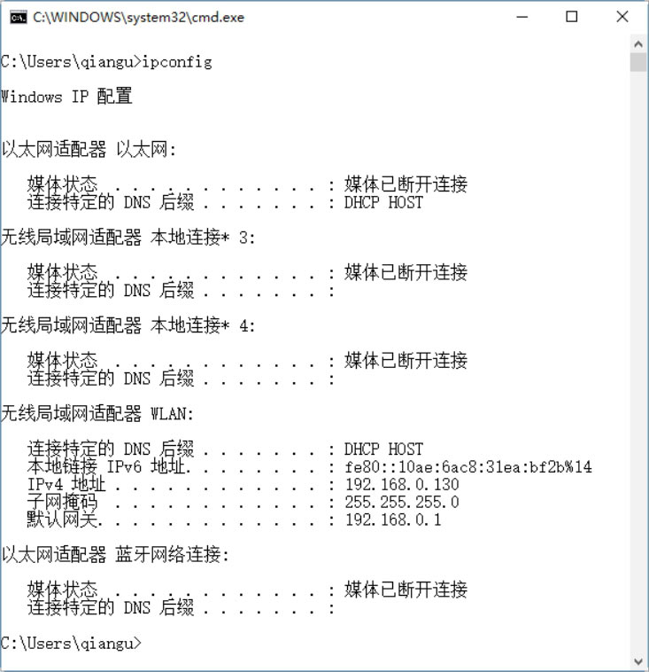 提示: 在“命令提示符”窗口中,192.168.0.130表示本机在局域网中的IP地址。