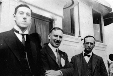 1927年8月21日,亚瑟·古迪纳夫、洛夫克拉夫特和W.保罗·库克在古迪纳夫位于佛蒙特州西博瑞特波罗的家门前。