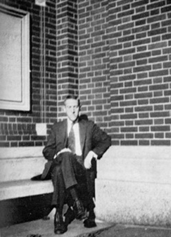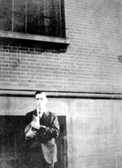 1933年(待考证),洛夫克拉夫特在普罗维登斯的布朗大学的范·温克尔大门前。