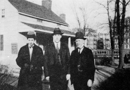 1922年4月11日,弗兰克·贝尔科纳福·朗、洛夫克拉夫特和詹姆斯·F.莫顿在纽约福特汉姆的爱伦·坡小屋。