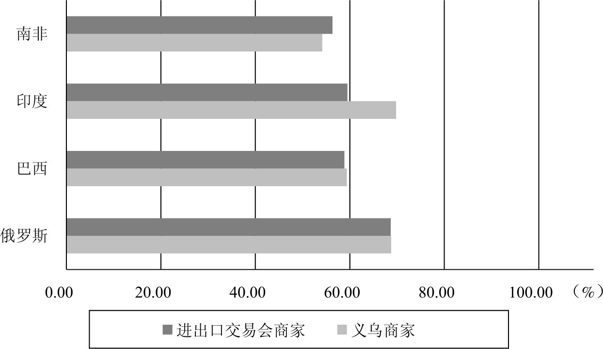 在所有被调查的对象中,与俄罗斯、印度、巴西、南非的联系程度占比如图4-3所示。其中,进出口交易会商家同其他金砖国家贸易往来比例从高到低为:俄罗斯、印度、巴西、南非;义乌商家的排序则为:印度、俄罗斯、巴西、南非。可以看出,由于双方贸易商品的侧重点不同,因此贸易合作伙伴的选择也不尽相同。但南非均排名垫底,可能是由于南非经济一直不景气,并且南非的法制建设有所衰退,导致与其贸易的风险有所上升。进出口交易会商家与印度的贸易往来比例远低于义乌商家的原因可能在于印度发展的不均衡性,印度虽然在部分基础产业上比较薄弱,但其高科技产业比较发达,其发展的不均衡性反而使义乌商家更加有利可图。