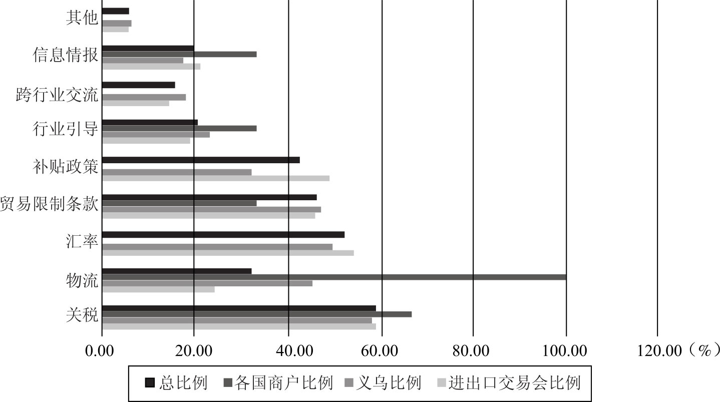 为了了解贸易活动的影响因素,我们在问卷中设计了相应的问题。图4-2显示了贸易活动影响因素的分布情况。调研结果显示,关税、汇率和贸易限制条款是影响贸易活动的前三位因素。对比分析发现,义乌商家认为关税、汇率和贸易限制条款是前三大因素;而进出口交易会商家则认为前三大因素依次为:关税、汇率和补贴政策;外国商家则认为物流、关税、信息情报三项会产生最重要的影响。