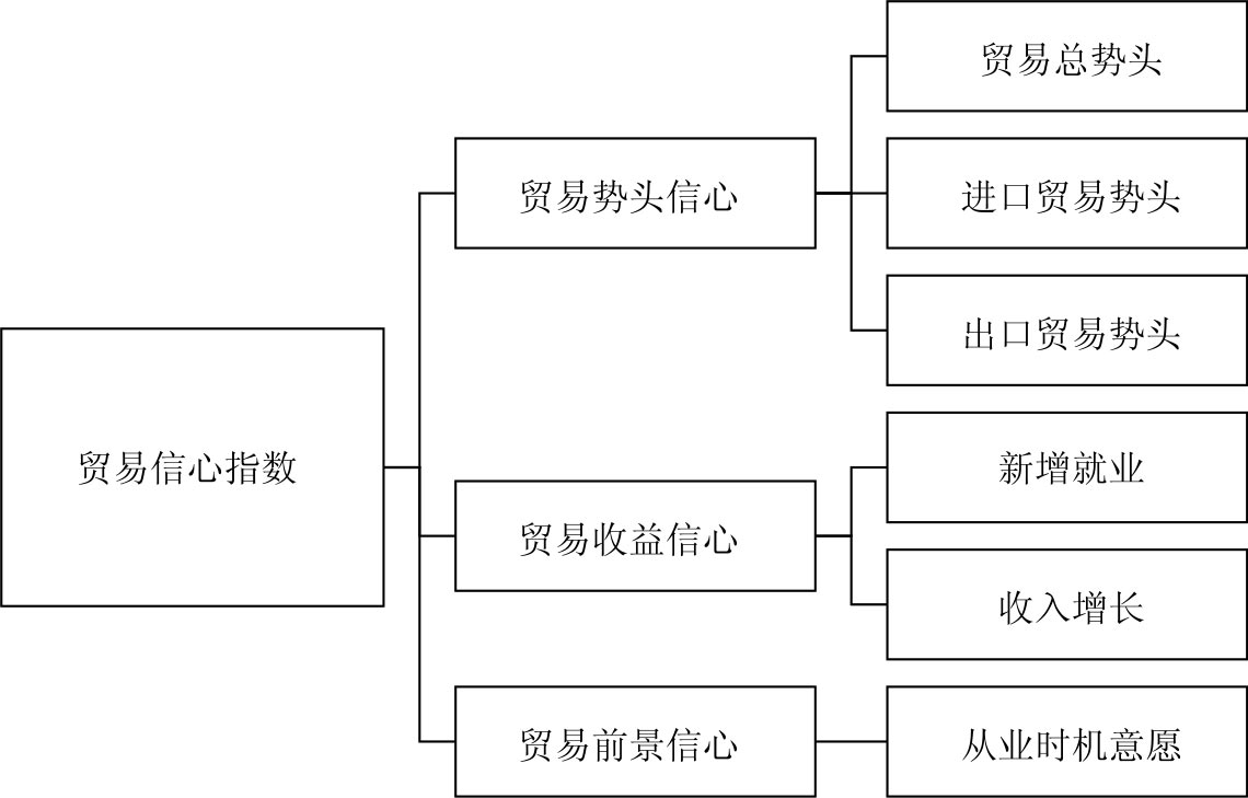 金砖国家贸易信息指数包括贸易势头信心、贸易收益信心和贸易前景信心三大特征指标,这三大特征指标具体又由6个二级指标构成。贸易势头信心包括贸易总势头、进口贸易势头、出口贸易势头三个子指标,体现被调查者对未来两年内中国与其他金砖国家的贸易前景和潜力的看法。贸易收益信心由新增就业和收入增长两个指标构成,反映未来两年内中国与其他金砖国家的双边贸易相关行业的就业形势以及从业人员收入增长情况。贸易前景信心则调查了贸易从业人员从事中国与其他金砖国家贸易活动的意愿和时机,其衡量了受访者进入中国与其他金砖国家贸易领域的可能性。贸易信心指数的指标体系结构如图4-1所示。