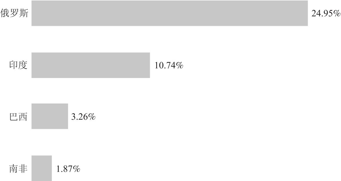 表2-5 金砖国家出口市场占有率增长率排名分布情况