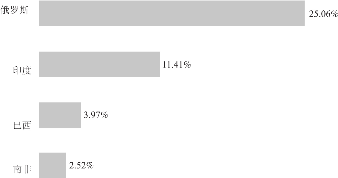 表2-16给出了2016年1月—2017年9月金砖各国的交叉进口市场占有率增长率排名。该表显示,各国的交叉进口市场占有率增长率的排名分布具有显著变化。为了更好地显示2016年1月至2017年9月金砖各国交叉进口市场占有率增长率的变化,我们绘制了金砖国家交叉进口市场占有率增长率均值的条形图。图2-9显示,样本期间内金砖国家交叉进口市场占有率增长率均值的排名,从大到小依次为:印度、俄罗斯、巴西与南非。这进一步说明,中国从俄罗斯进口占俄罗斯总出口的份额增长较快。