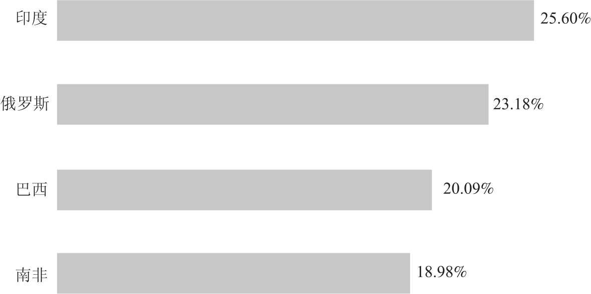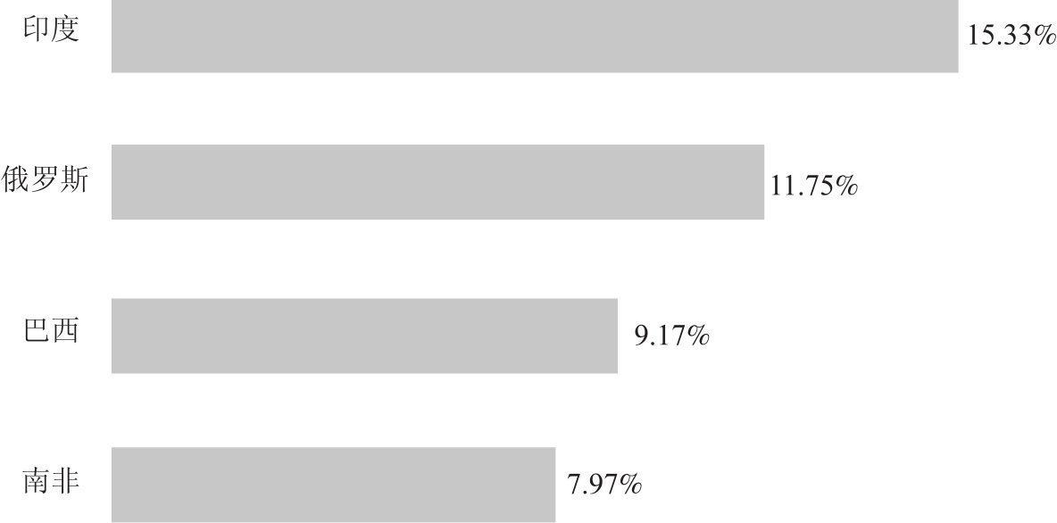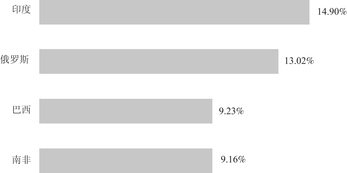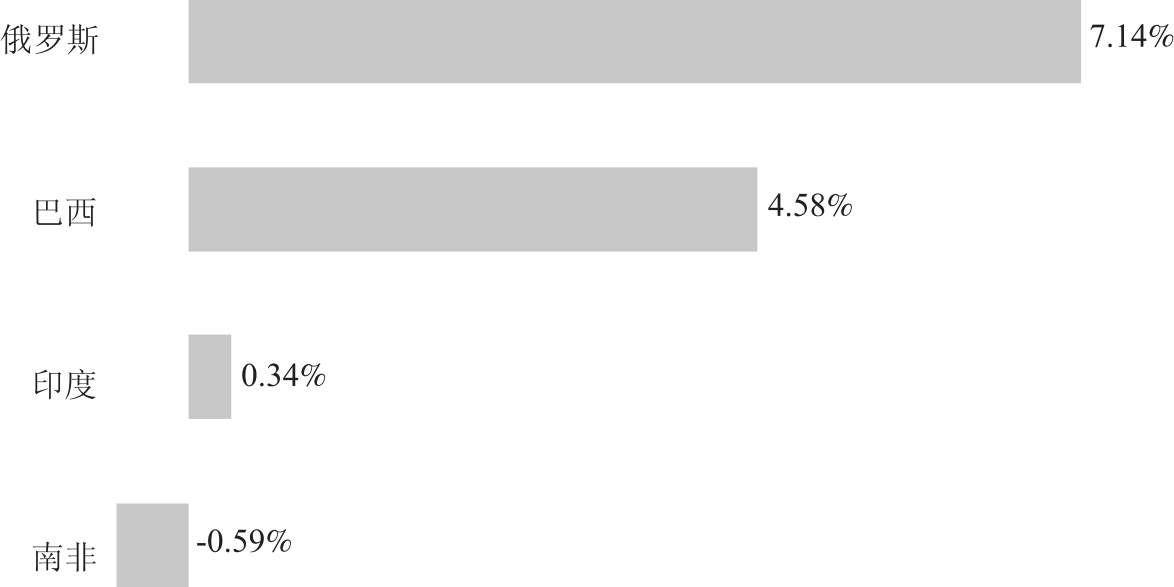 图2-8 金砖国家进口市场占有率增长率排名条形图