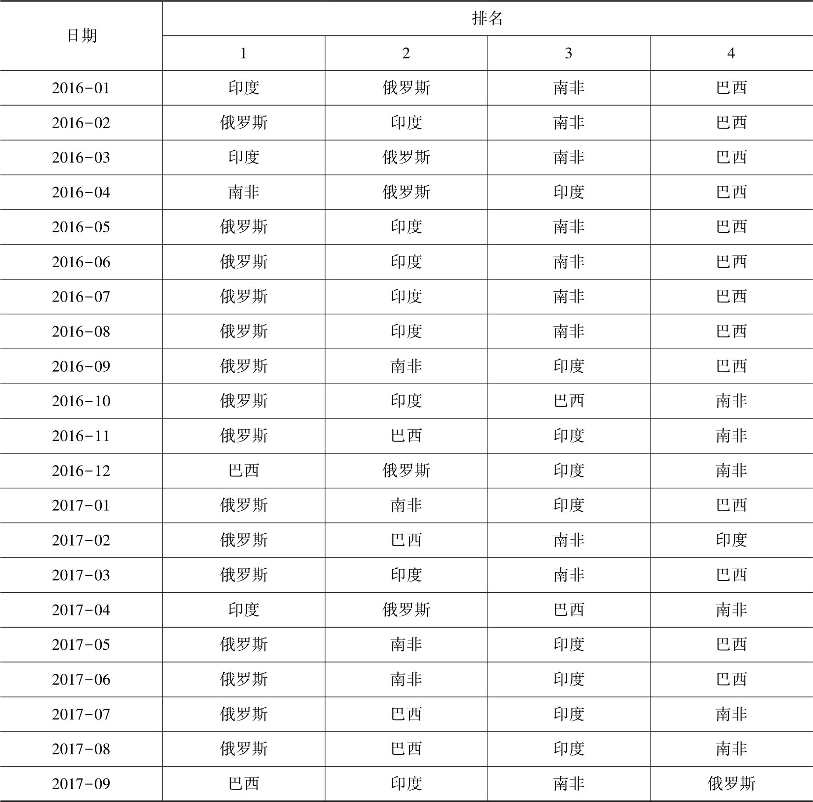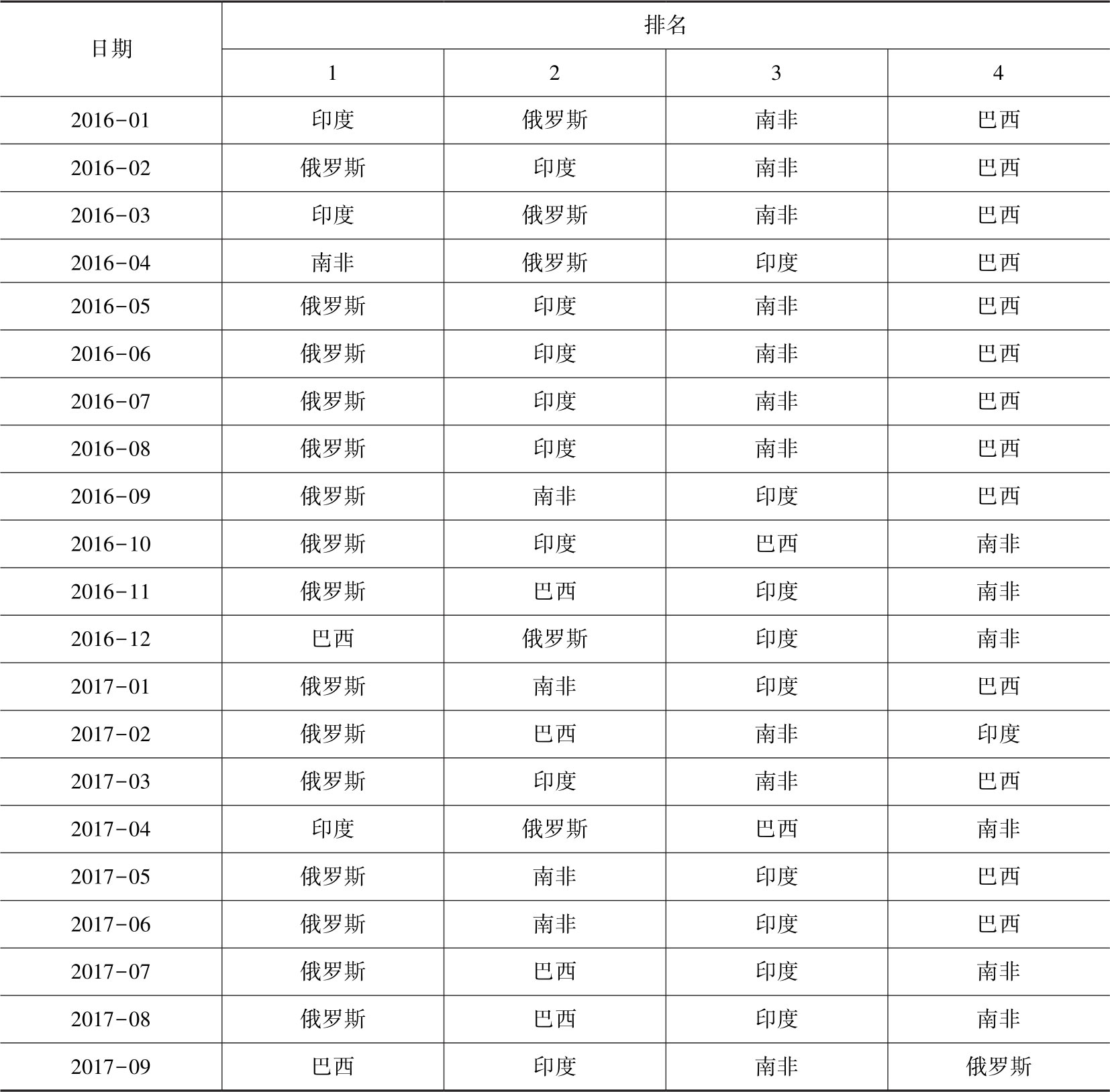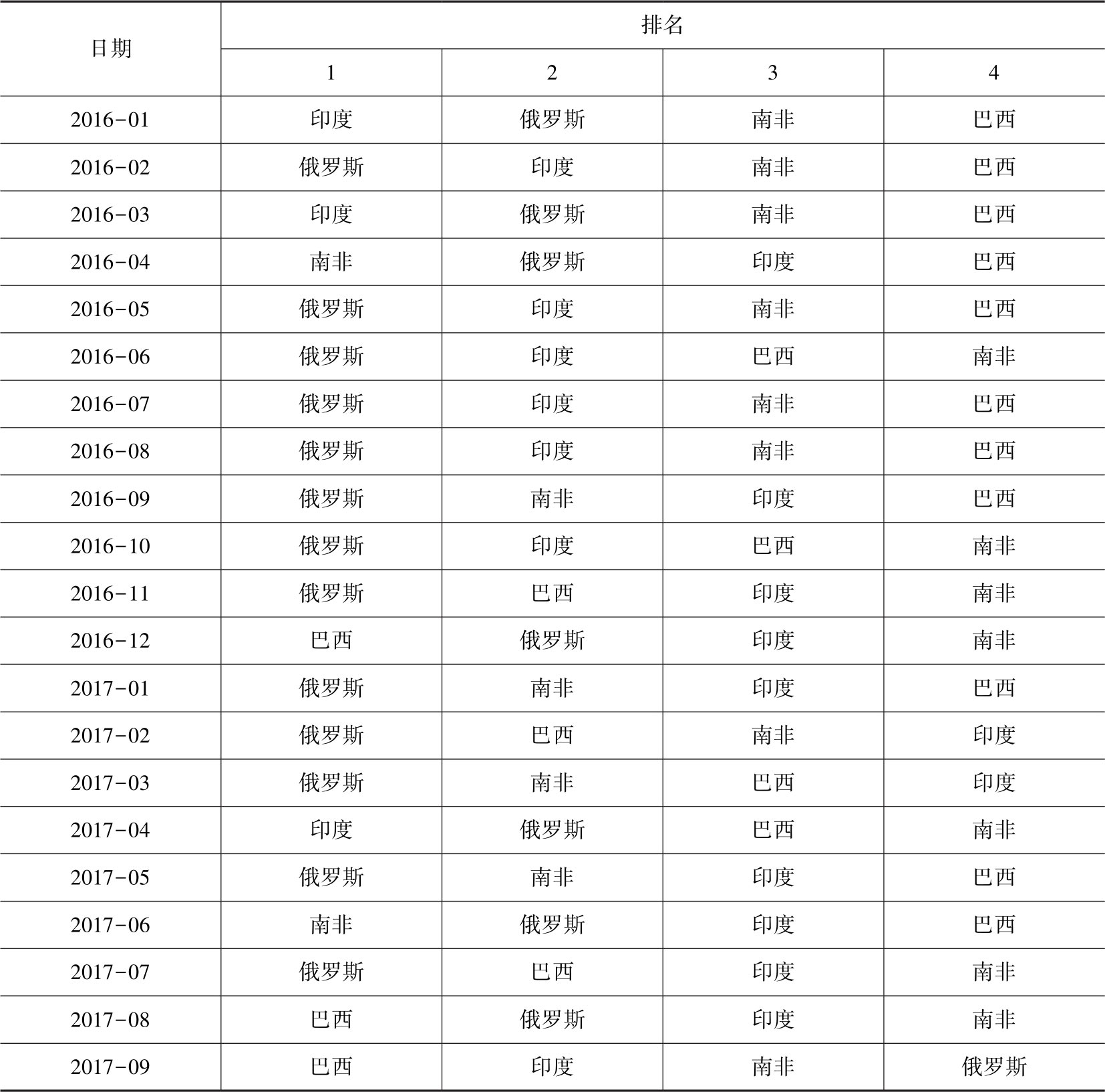 表2-3 金砖国家出口贸易活力指数排名分布情况