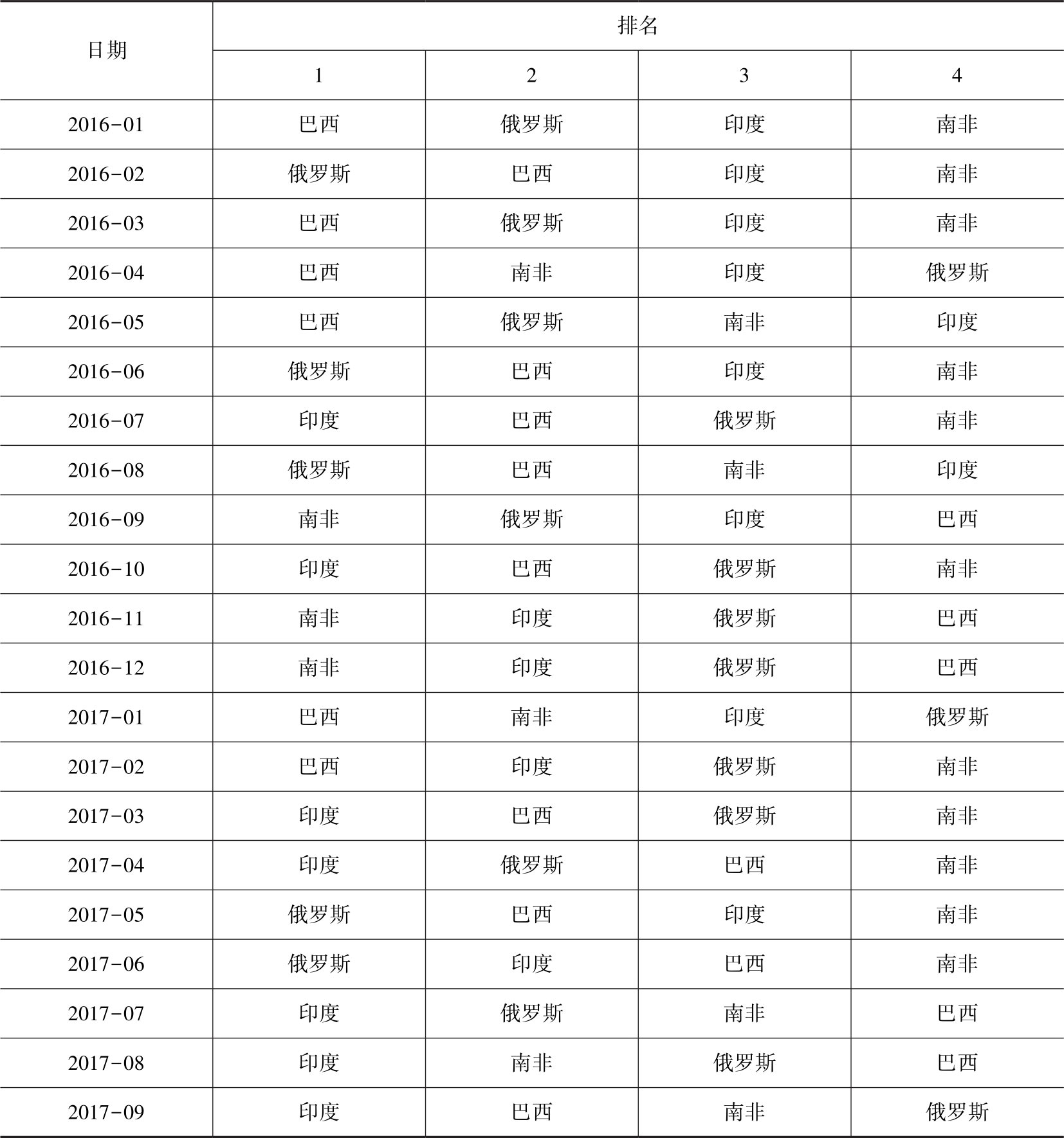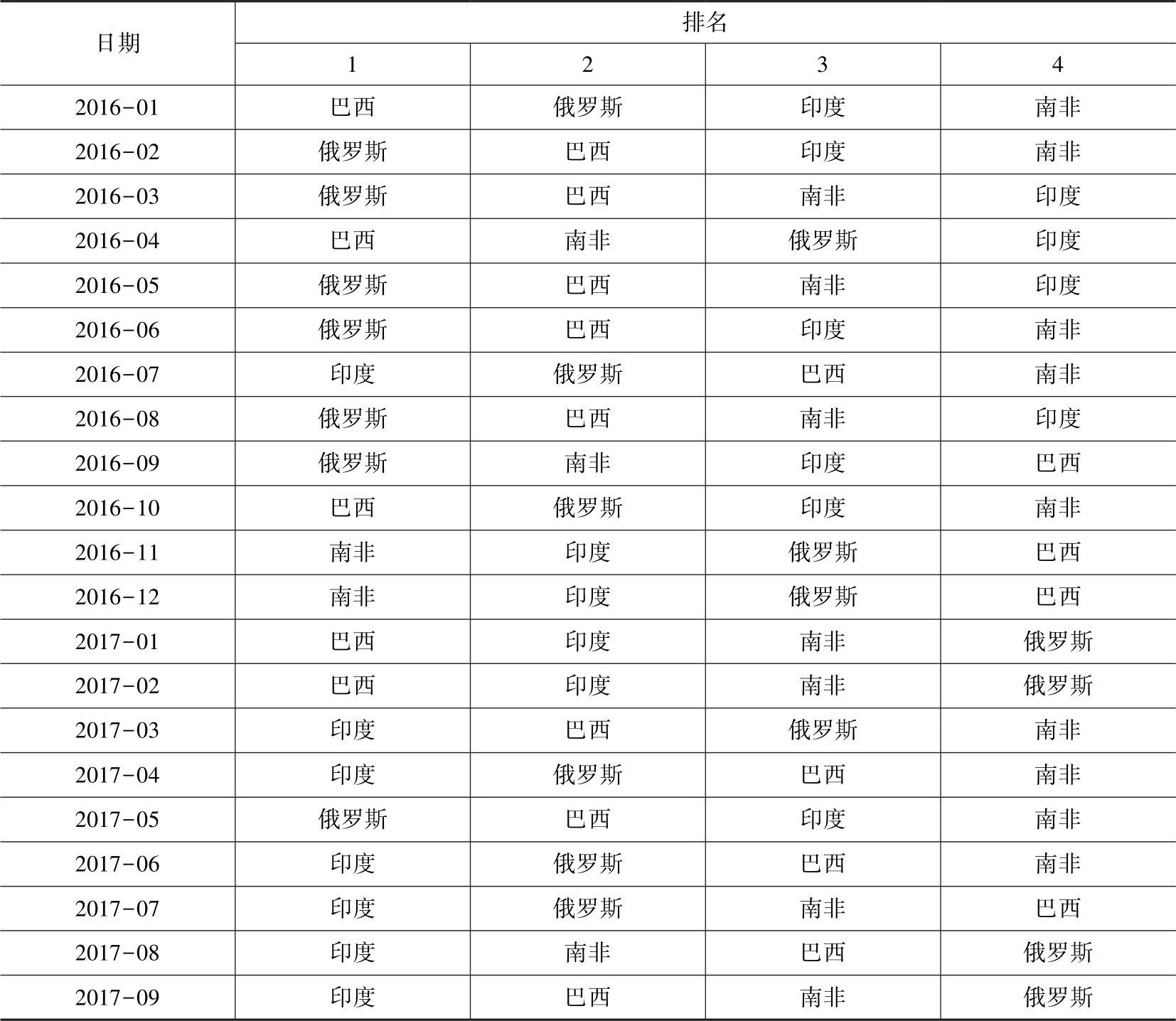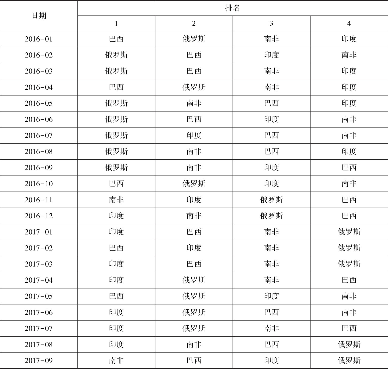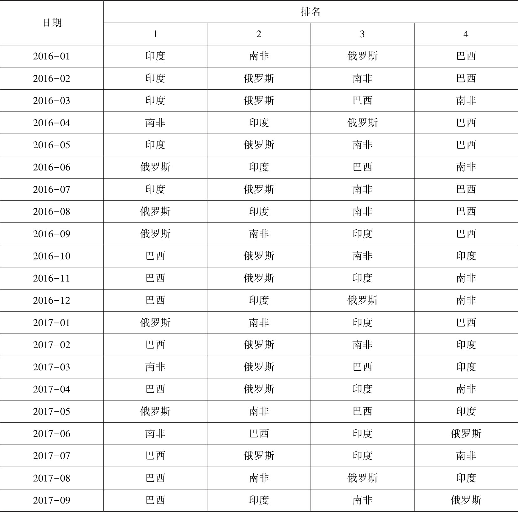 表2-3 金砖国家出口贸易活力指数排名分布情况