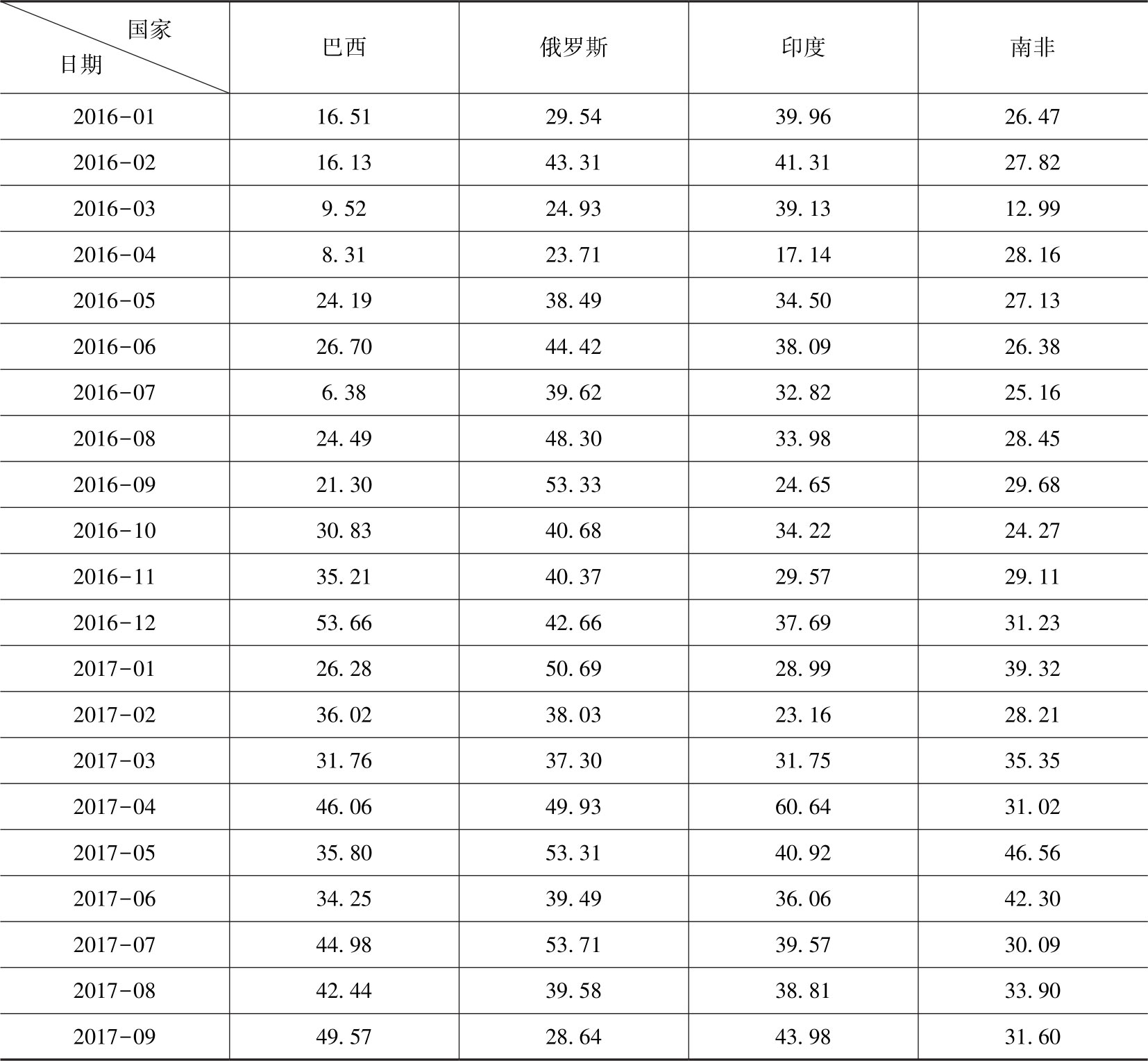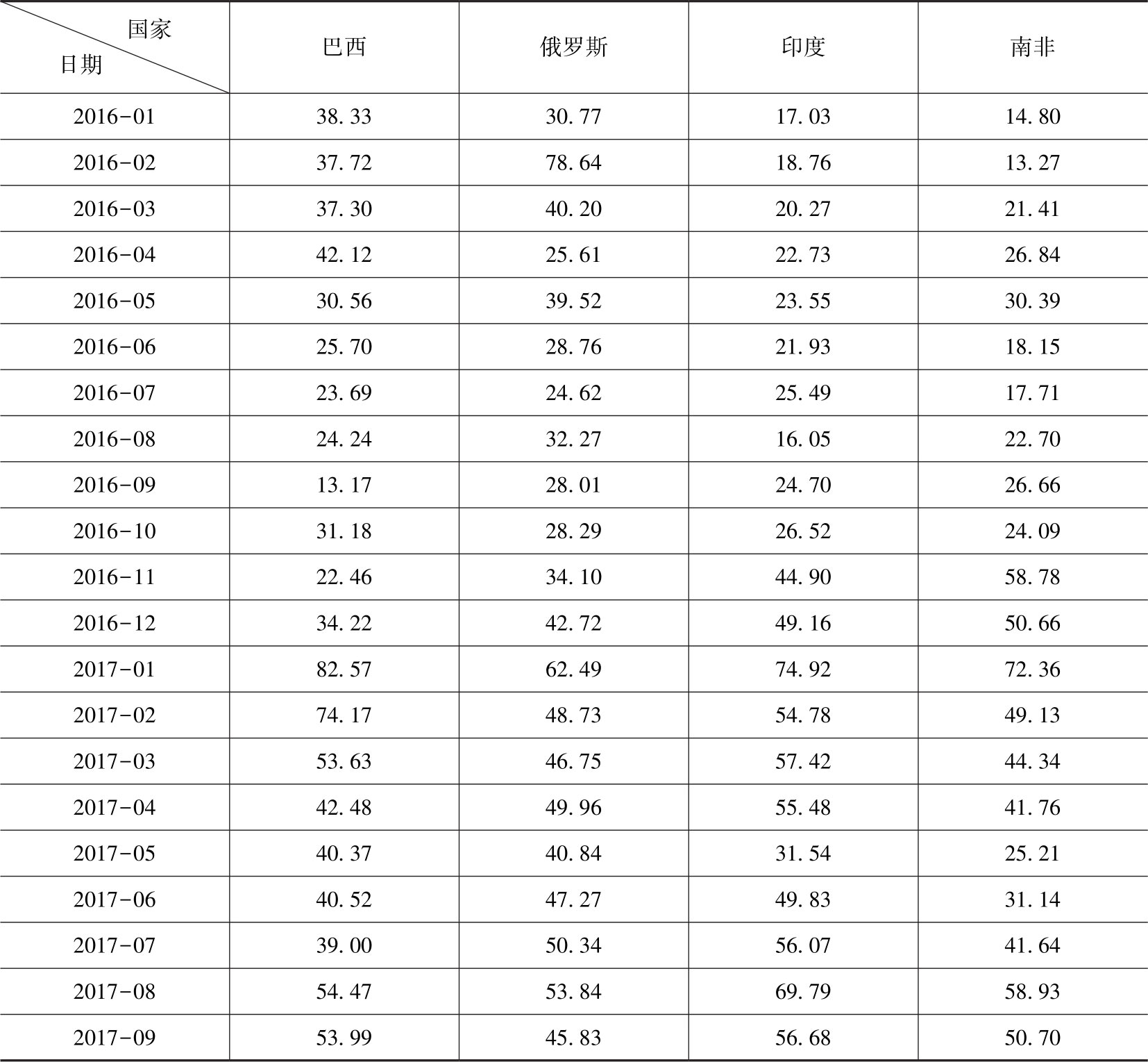 基于金砖国家出口贸易活力指数构建框架,利用2010年1月—2017年9月中国与其他金砖国家进出口的月度数据,我们测算得到2016年1月至2017年9月金砖国家出口贸易活力指数。金砖国家出口贸易活力指数介于[0,100],指数值越接近于100,表示中国向其他金砖各国出口货物成长能力越强;指数值越接近于0,表示中国向其他金砖各国出口货物成长能力越弱。