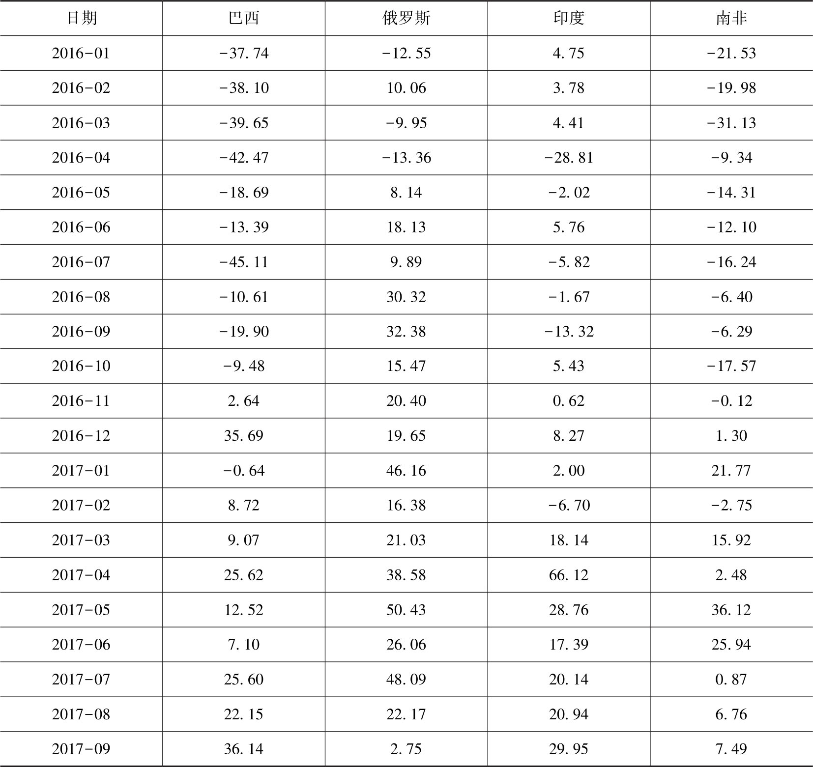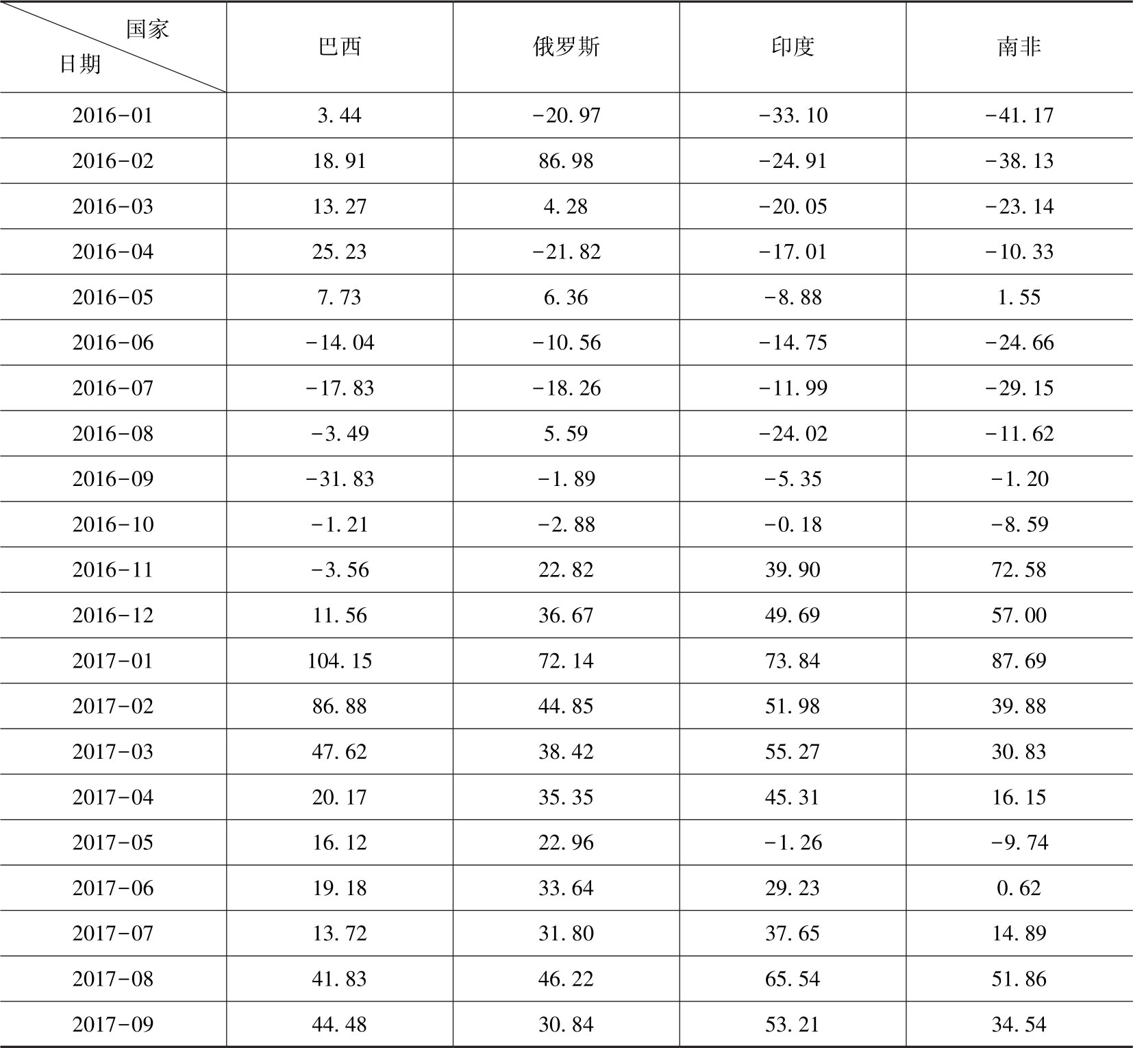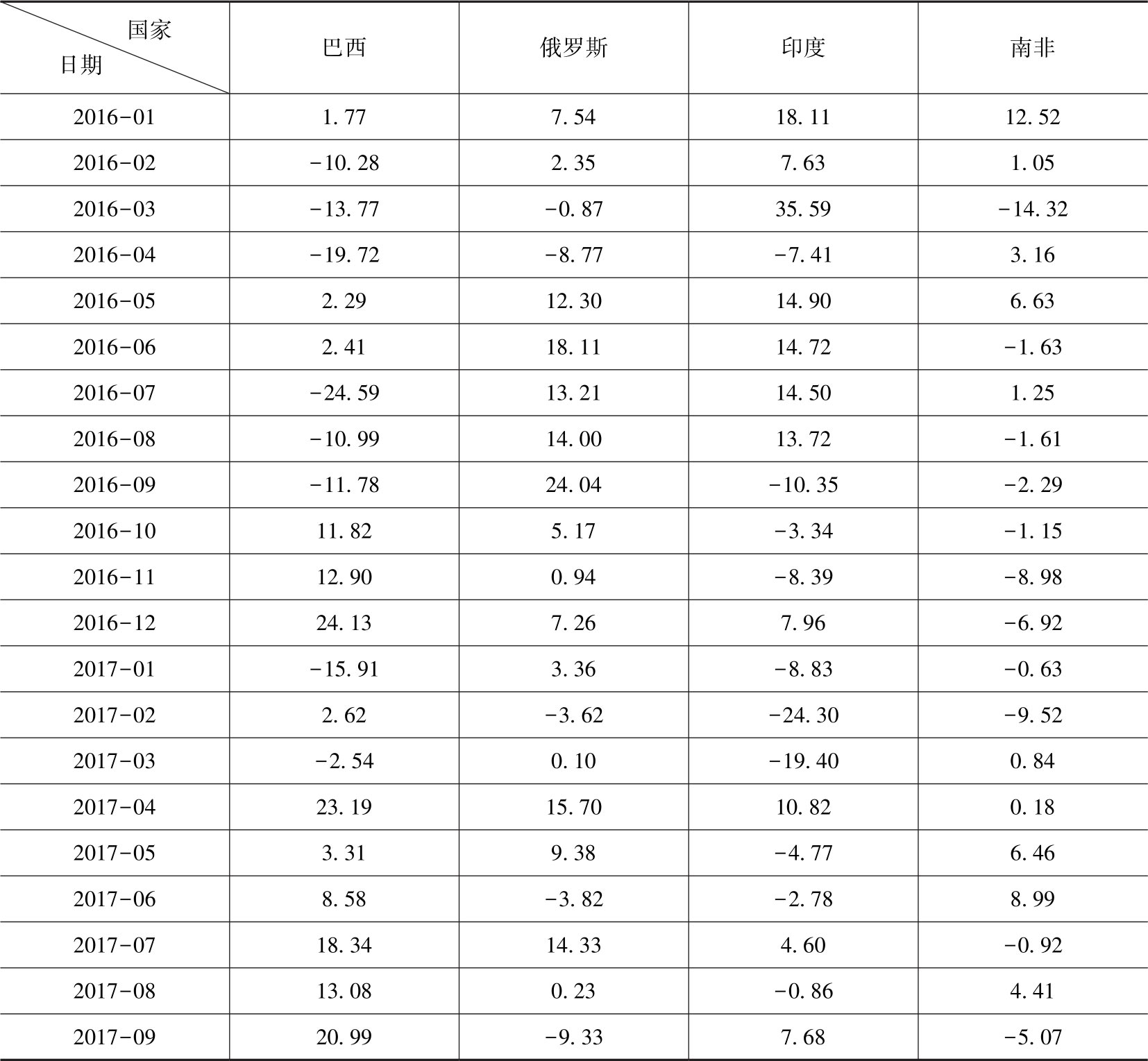 表2-9给出了2016年1月—2017年9月金砖各国的出口增长率排名。该表显示,各国的出口增长率排名分布具有显著变化。为了更好地显示2016年1月至2017年9月金砖各国出口增长率的变化,我们绘制了金砖国家出口增长率均值的条形图。图2-5显示,样本期间内金砖国家出口增长率均值的排名,从大到小依次为:俄罗斯、印度、巴西与南非。这进一步说明,中国向俄罗斯的出口具有增长较快。