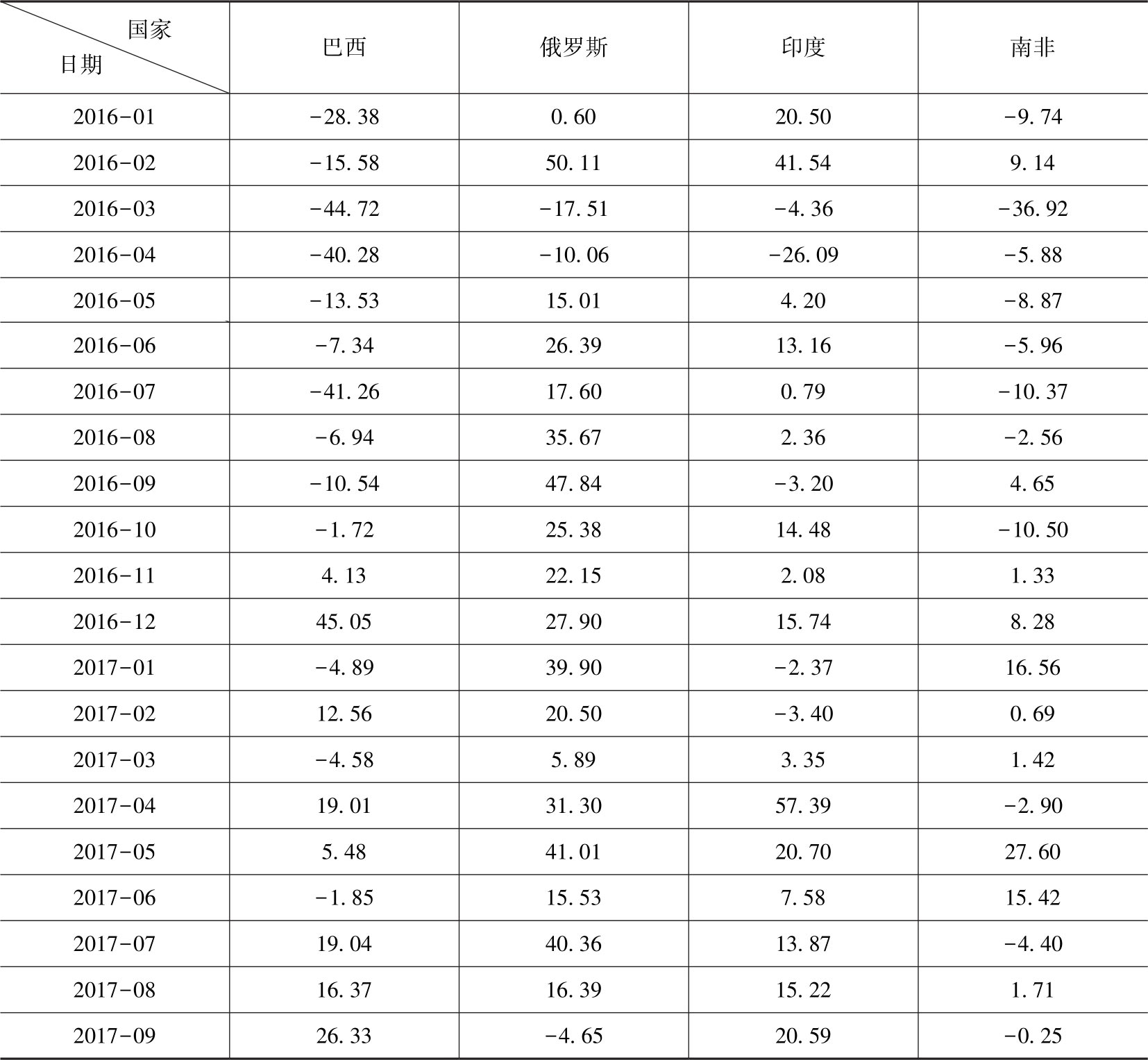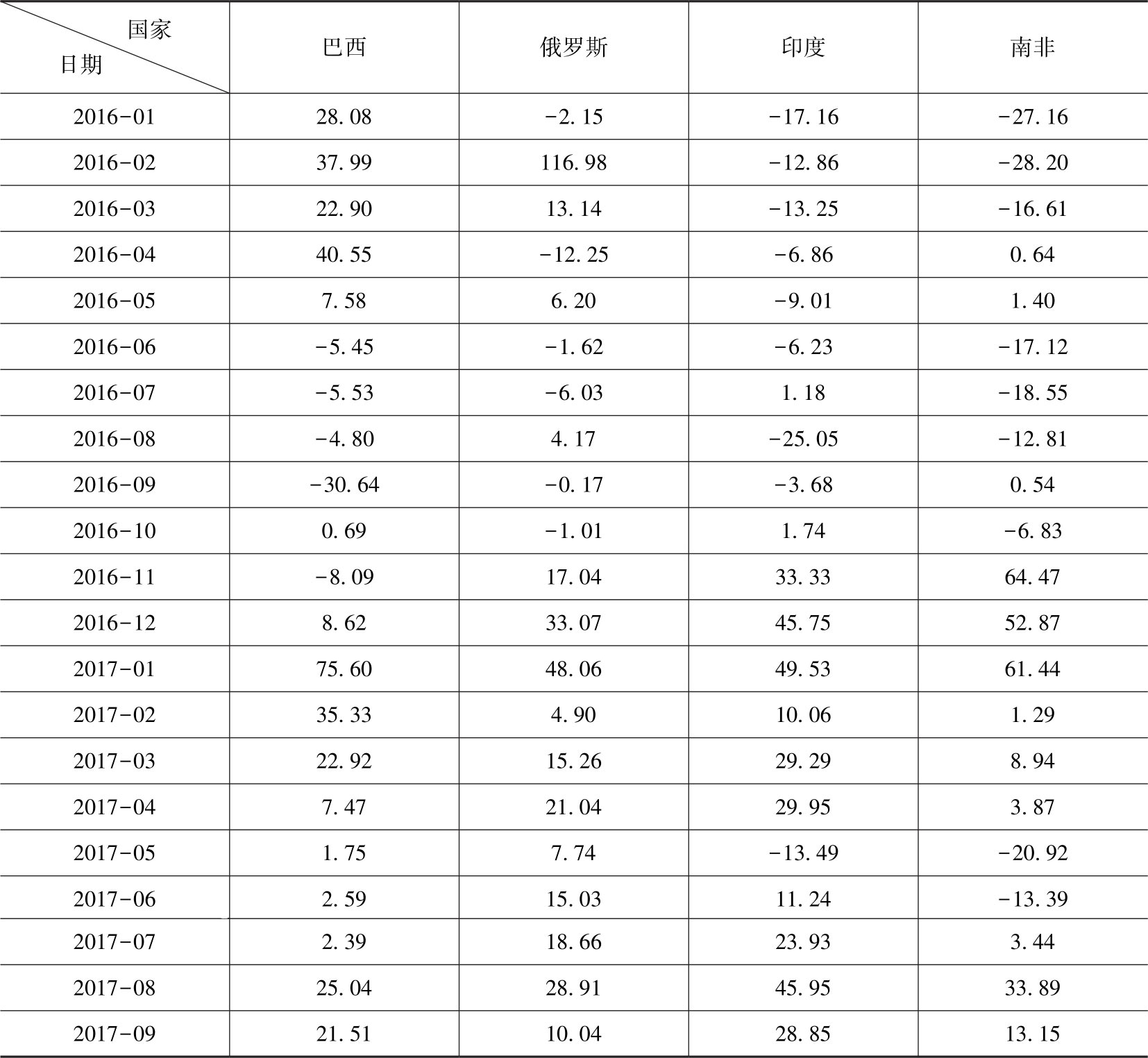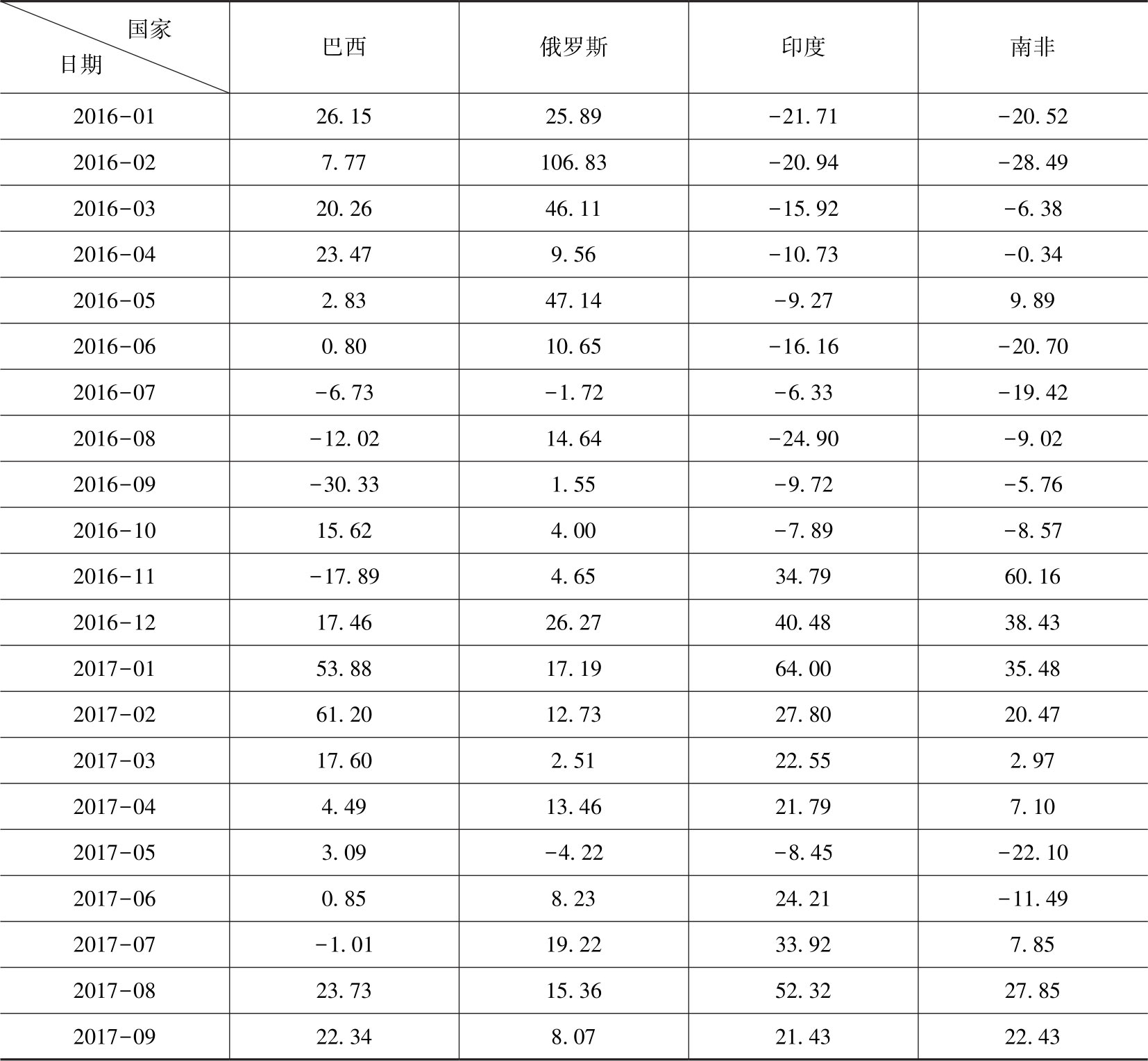 表2-9给出了2016年1月—2017年9月金砖各国的出口增长率排名。该表显示,各国的出口增长率排名分布具有显著变化。为了更好地显示2016年1月至2017年9月金砖各国出口增长率的变化,我们绘制了金砖国家出口增长率均值的条形图。图2-5显示,样本期间内金砖国家出口增长率均值的排名,从大到小依次为:俄罗斯、印度、巴西与南非。这进一步说明,中国向俄罗斯的出口具有增长较快。
